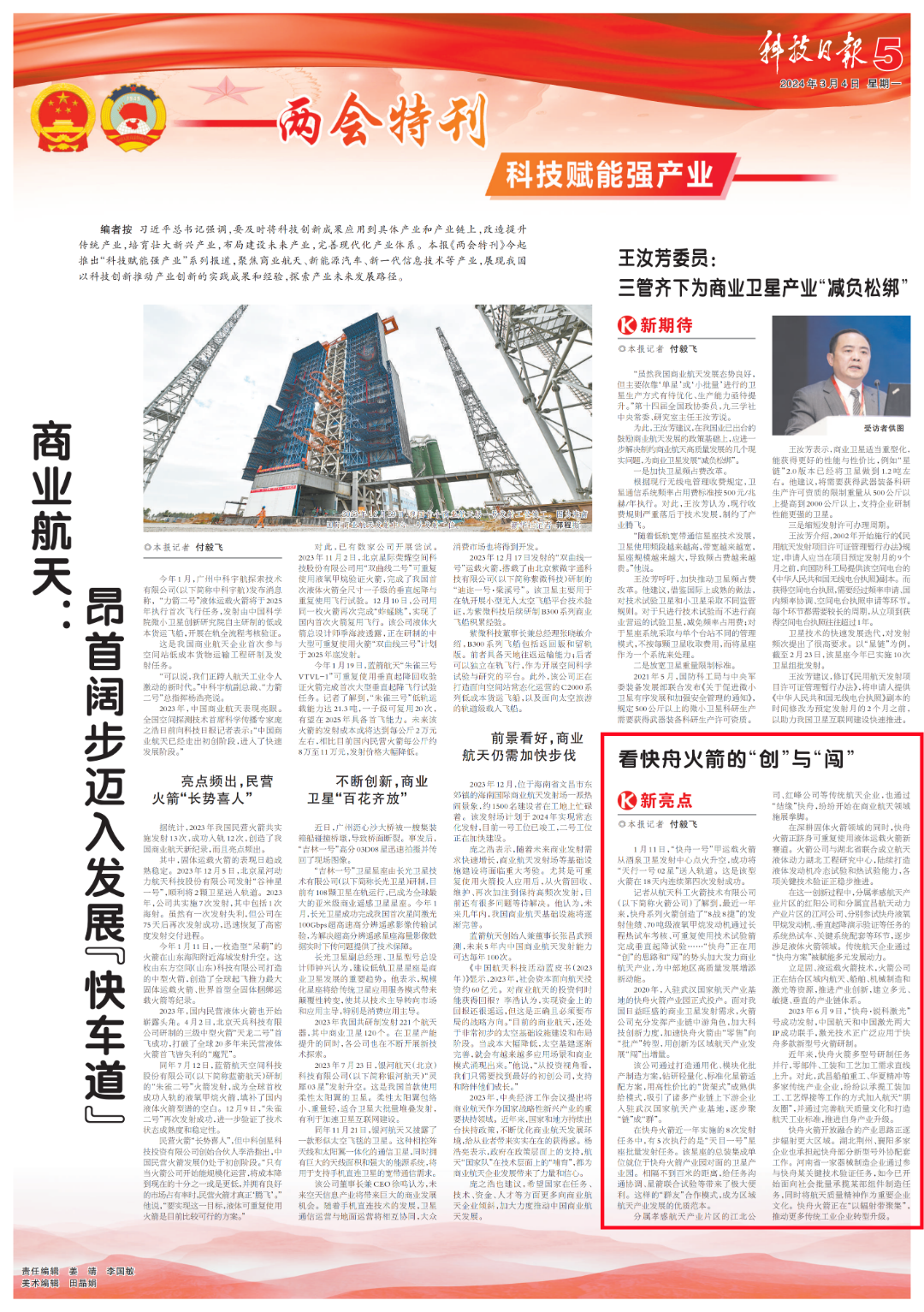 全國(guó)兩會(huì)召開之際,《科技日?qǐng)?bào)》兩會(huì)特刊推出“科技賦能強(qiáng)產(chǎn)業(yè)”系列報(bào)道,展現(xiàn)我國(guó)以科技創(chuàng)新推動(dòng)產(chǎn)業(yè)創(chuàng)新的實(shí)踐成果和經(jīng)驗(yàn),探索產(chǎn)業(yè)未來發(fā)展路徑。3月4日刊發(fā)題為《看快舟火箭的“創(chuàng)”與“闖”》的文章,聚焦中國(guó)航天科工航天三江商業(yè)航天產(chǎn)業(yè)高質(zhì)量發(fā)展。