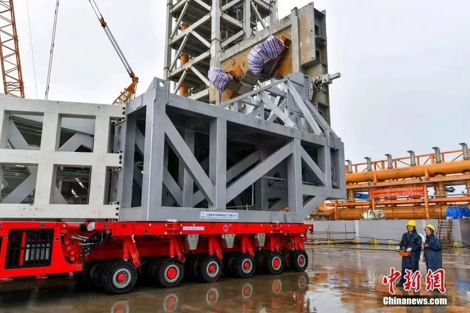 長征十二號火箭是我國首型4米級運載火箭,全長約62米,起飛質量約430噸。配套的起豎系統高70米、重240噸。該型火箭為商業航天而生,屬于“大高個”、大直徑、大推力,實現了火箭運載能力的大幅提升。在運輸過程中,三輛自行式模塊運輸車呈“品”字形結構擺放,分別位于起豎系統的下方,穩穩地托舉住火箭及起豎系統,實現全箭水平轉運。