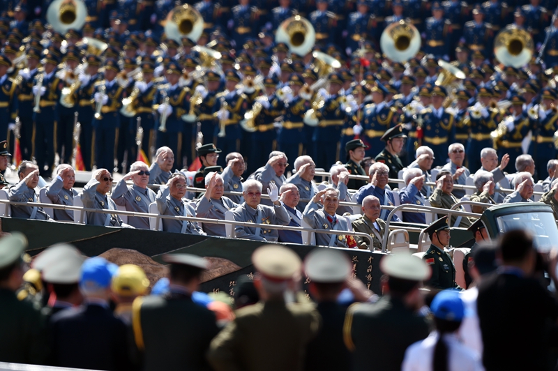 2015年9月3日,中國(guó)人民抗日戰(zhàn)爭(zhēng)暨世界反法西斯戰(zhàn)爭(zhēng)勝利70周年紀(jì)念大會(huì)在北京隆重舉行。這是抗戰(zhàn)老兵乘車方隊(duì)通過天安門廣場(chǎng)。新華社記者 王定昶 攝