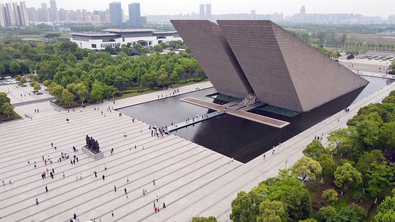 游客在合肥渡江戰(zhàn)役紀(jì)念館參觀游覽(2021年5月3日,無人機(jī)照片)。新華社記者 周牧 攝