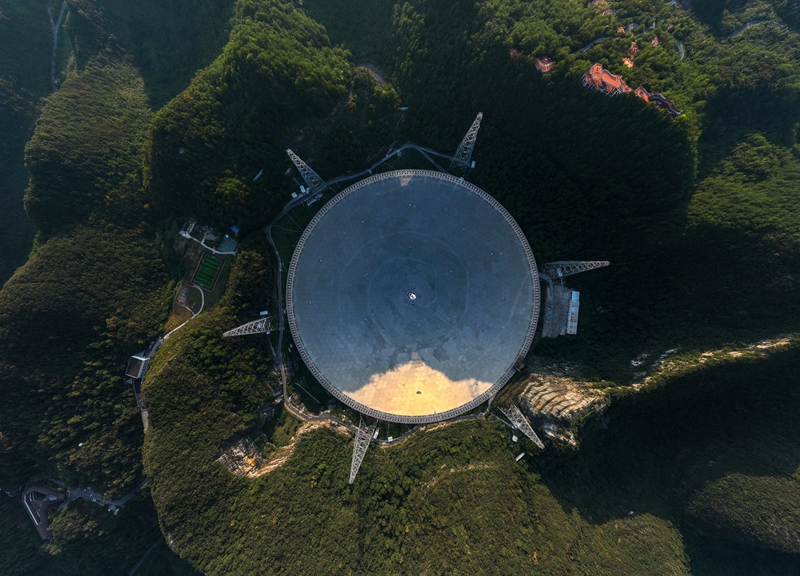 中國(guó)天眼在落日余暉中(無人機(jī)照片,維護(hù)保養(yǎng)期間拍攝,2024年9月25日攝)。新華社記者 劉續(xù) 攝